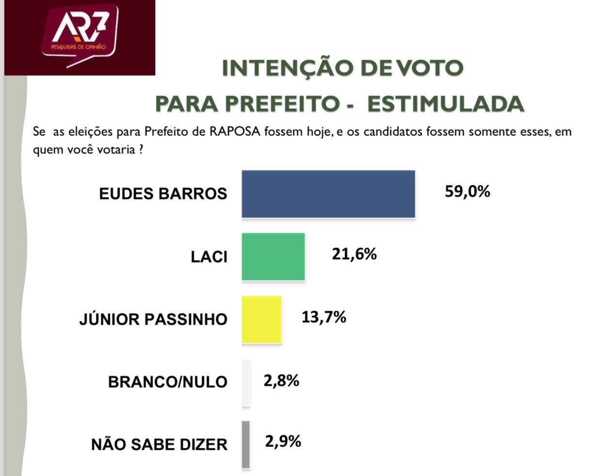 O candidato a prefeito de Raposa, José Laci de Oliveira, junto com a Comissão Provisória Municipal do Partido Socialista Brasileiro (PSB), tentou suspender a divulgação de uma pesquisa eleitoral realizada pela AR7 Pesquisas Inteligentes Ltda, que aponta uma ampla vantagem para o atual prefeito e candidato à reeleição, Eudes Barros (PL). A pesquisa, registrada sob o número MA-03469/2024, mostra Eudes com liderança expressiva nas intenções de voto e destaca uma grande rejeição de José Laci por parte do eleitorado.